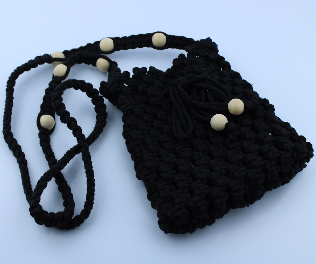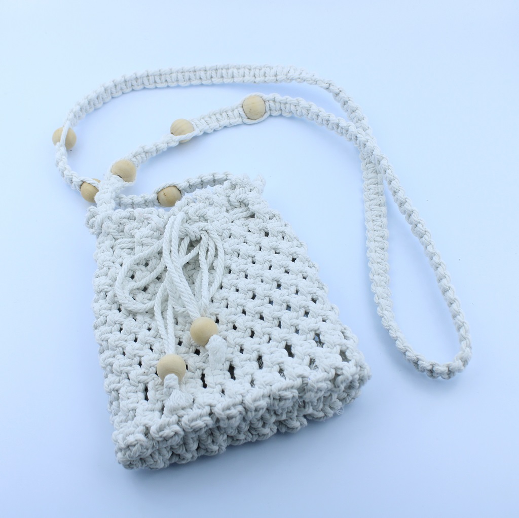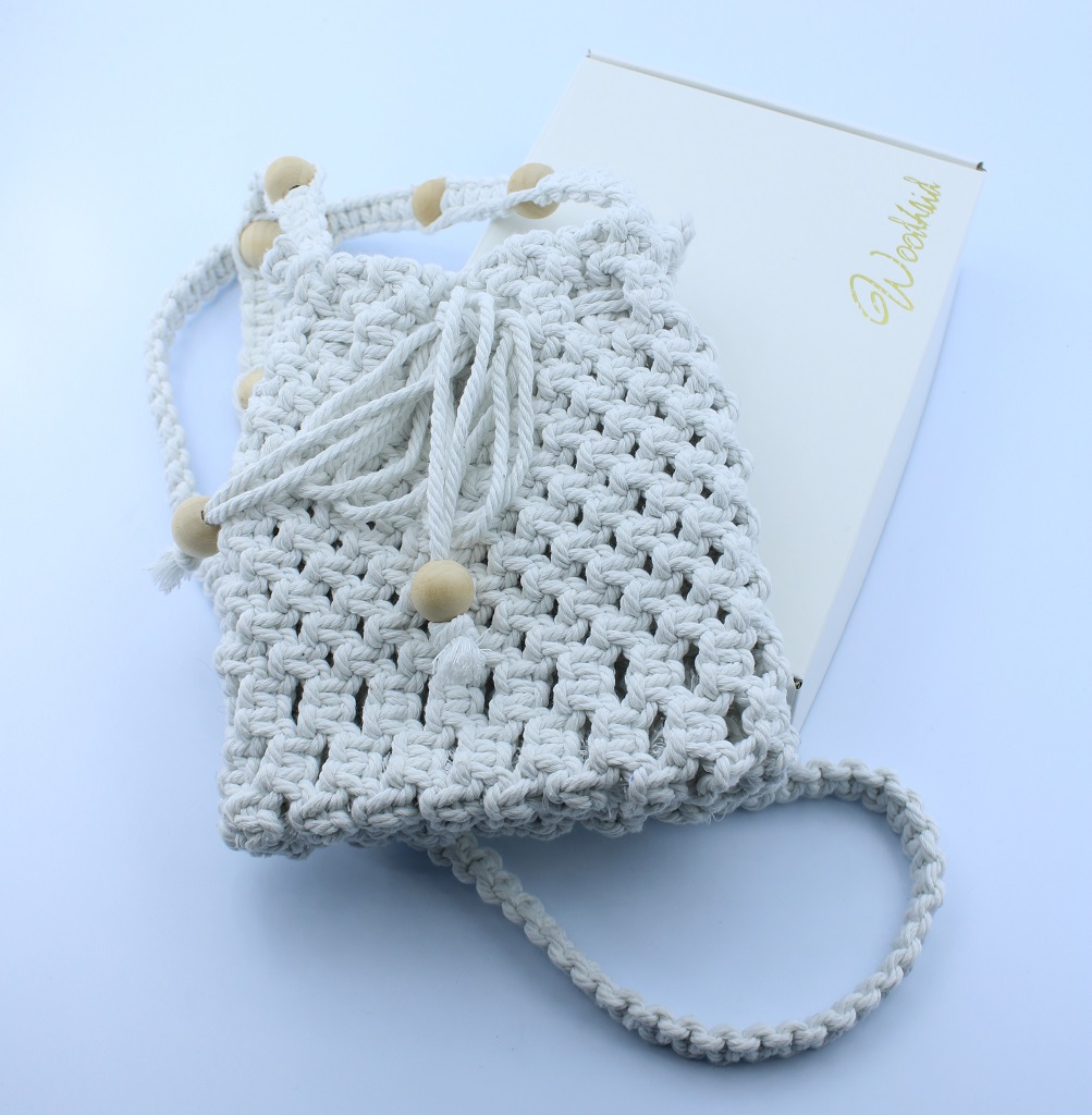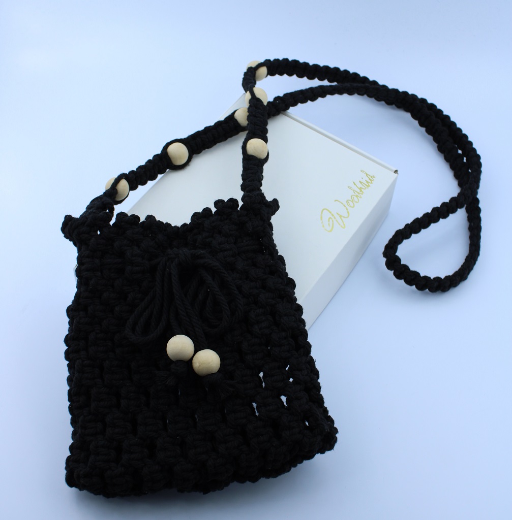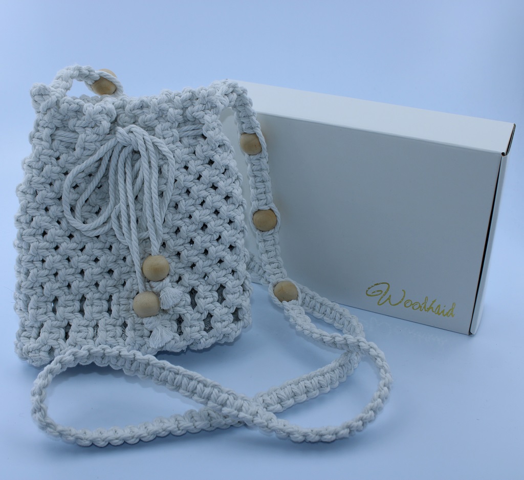 Elegant and functional, this handmade macramé drawstring bag from Woodhaid blends natural beauty and practicality. Crafted with 100% cotton cord, it features a braided strap decorated with wooden beads and a drawstring closure for secure storage.