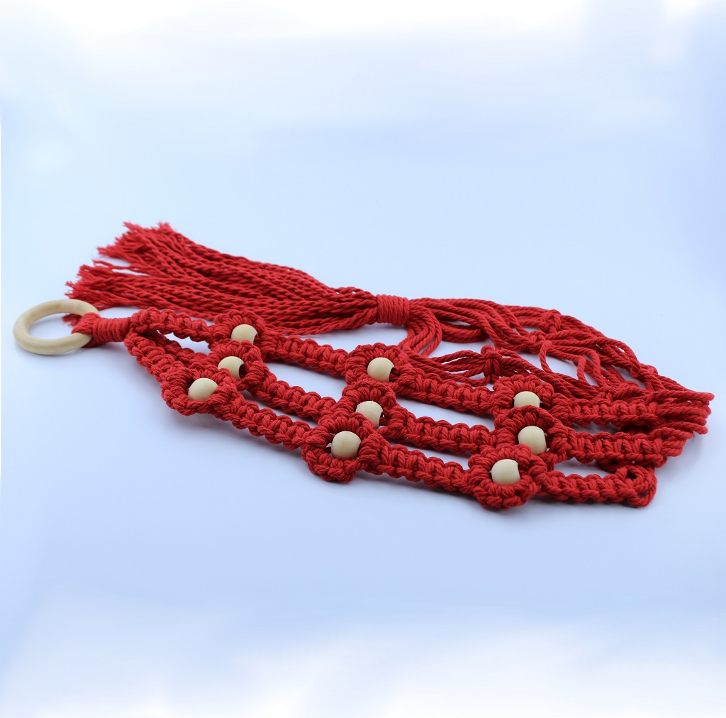 Add a touch of elegance to your space with this handcrafted macramé plant hanger, featuring one color, nine delicate flowers, and a unique three-legged design. Perfect for showcasing plants in style, this beautiful piece brings charm and sophistication to any room.