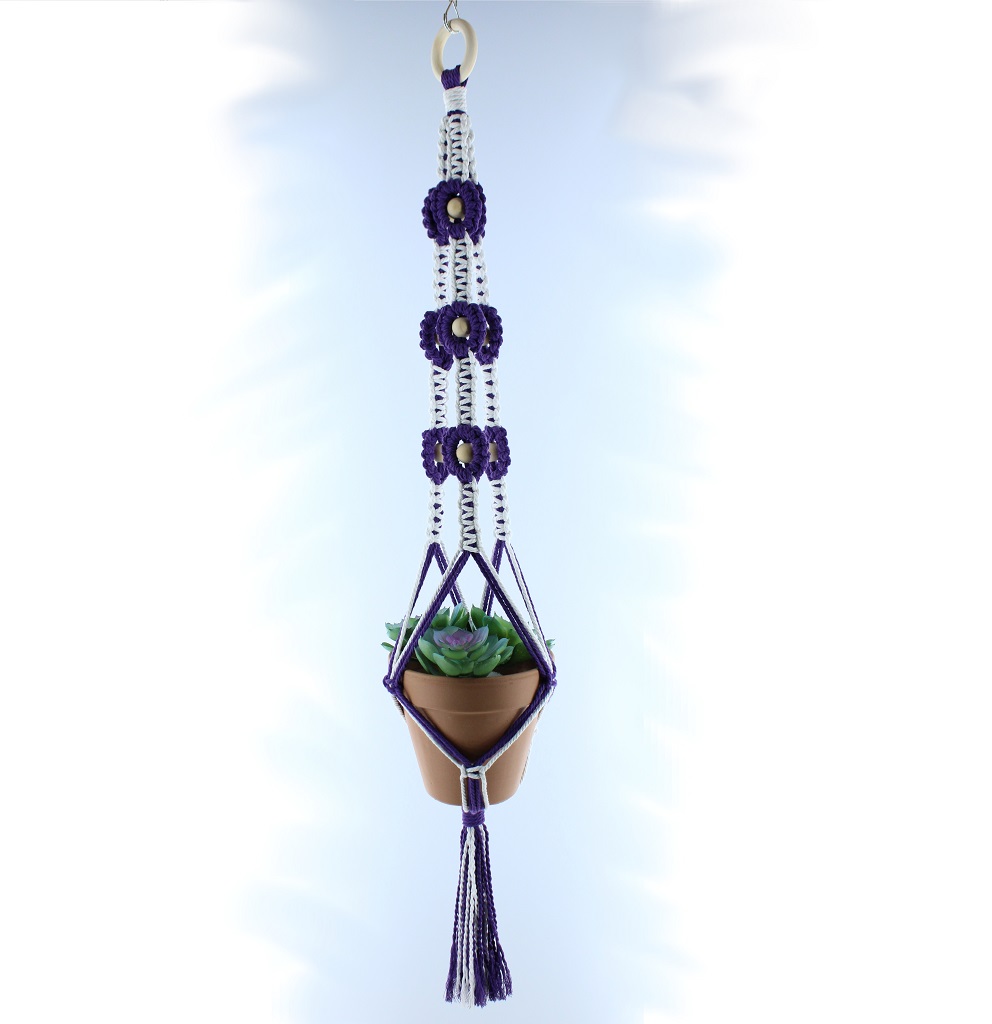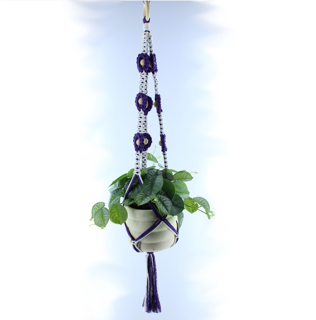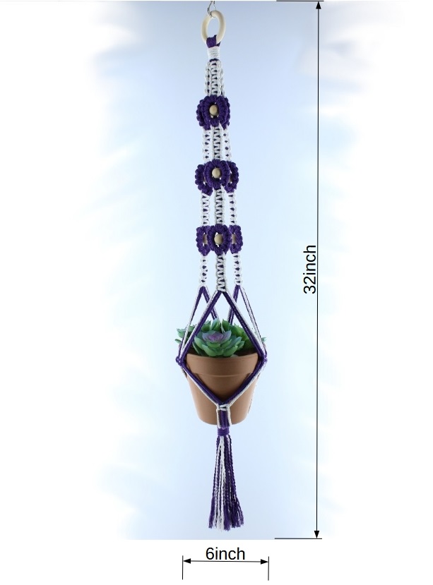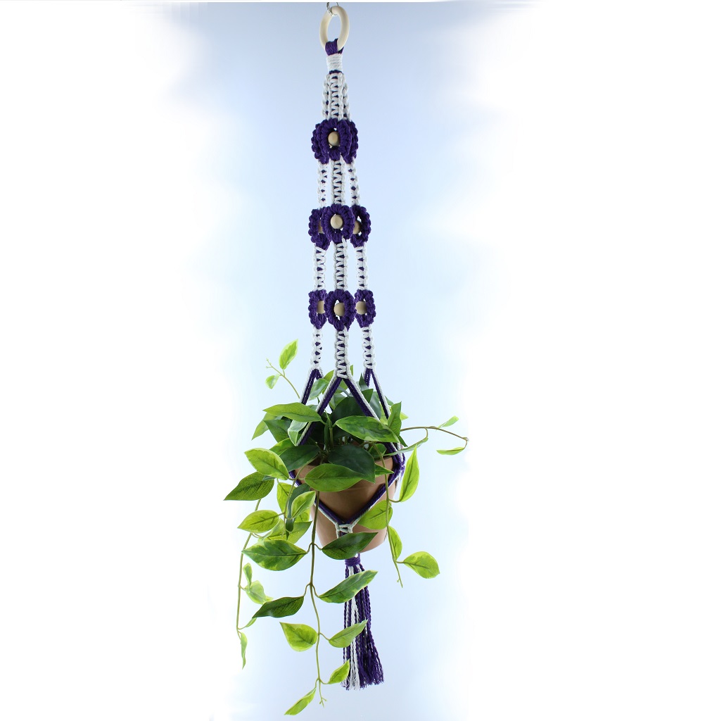 Add a touch of elegance to your space with this handcrafted macramé plant hanger, featuring two colors, nine delicate flowers, and a unique three-legged design. Perfect for showcasing plants in style, this beautiful piece brings charm and sophistication to any room.