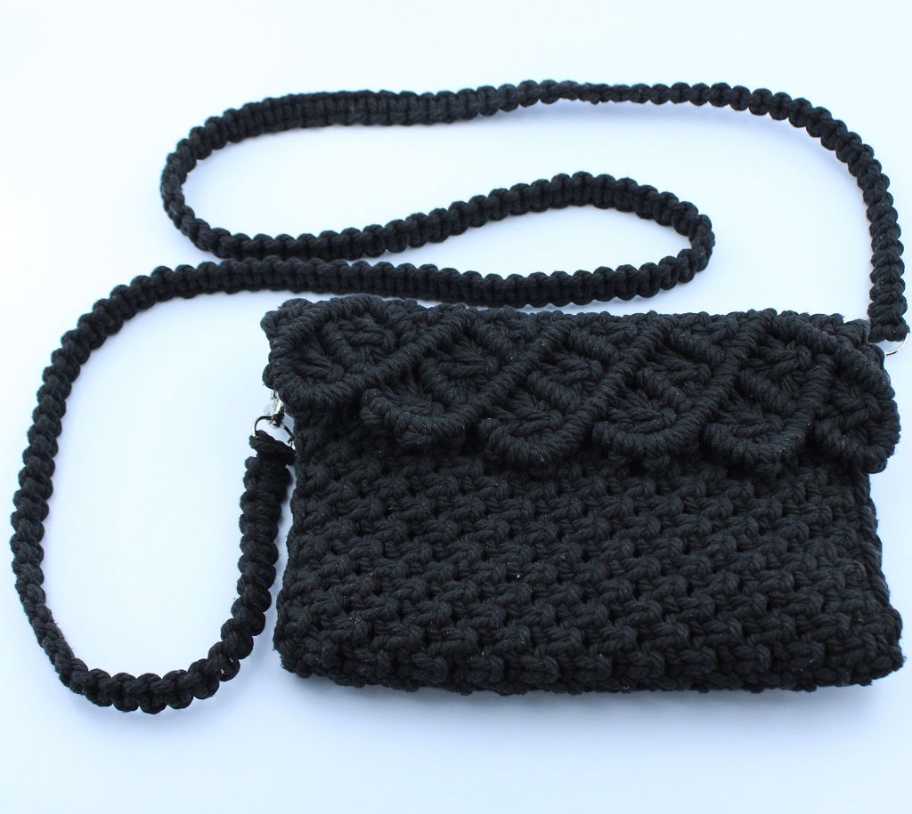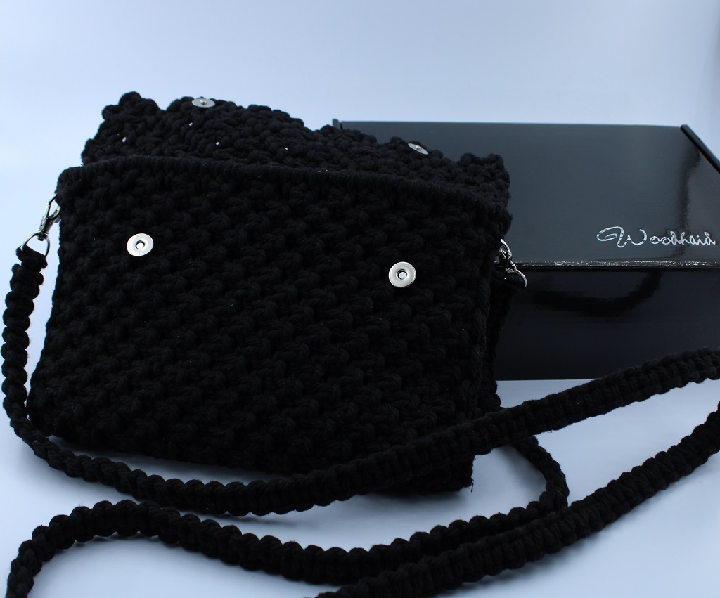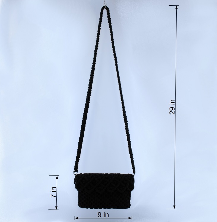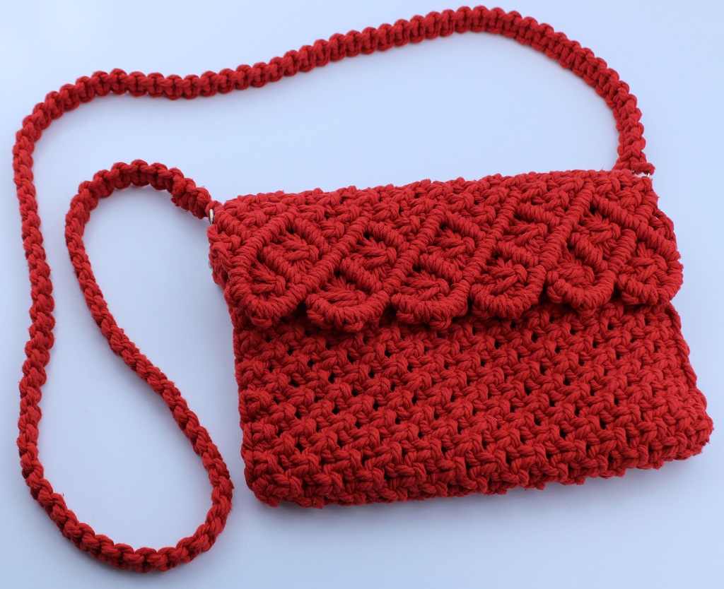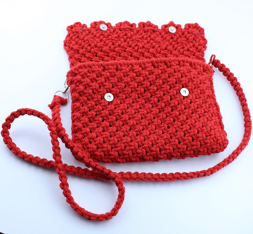 Add a vibrant touch to your outfit with this handmade macramé shoulder bag from Woodhaid. Crafted with 100% natural cotton cord in a bold red/black tone, it features an elegant woven flap with a scalloped design and a braided strap for comfortable wear. The bag includes magnetic snap closures for security and functionality while keeping its artisan charm.