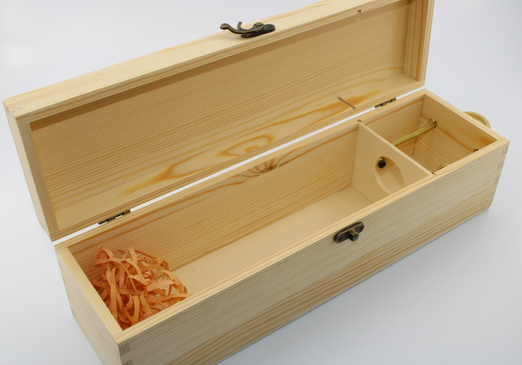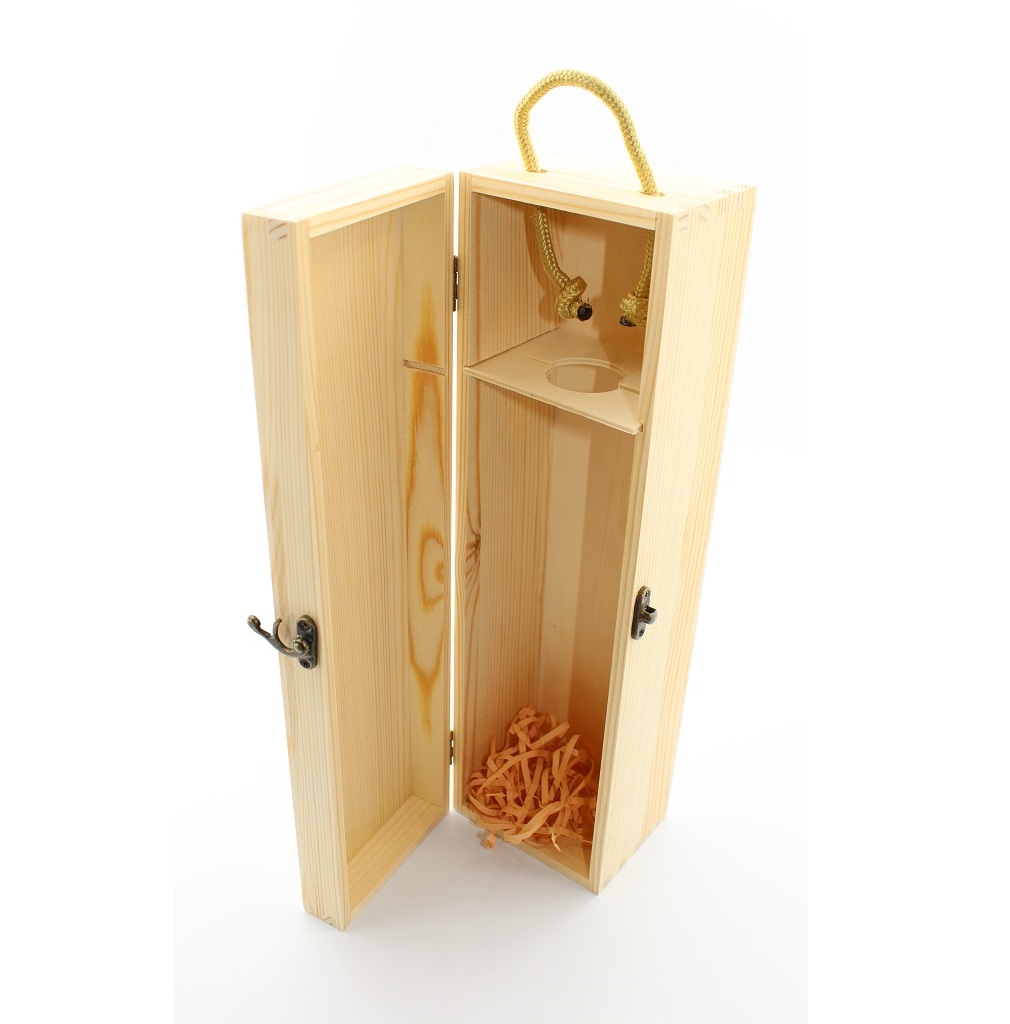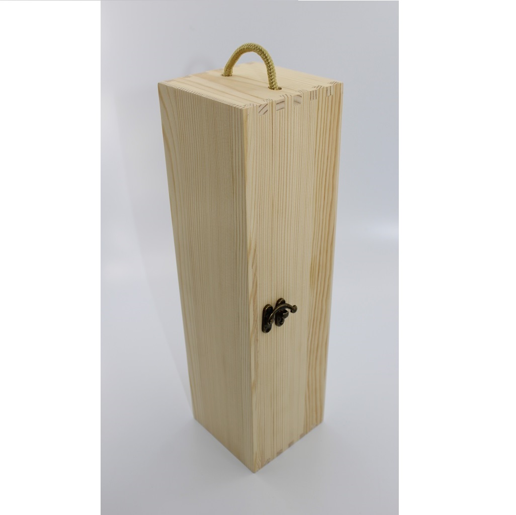 + Shipping Calculated at CheckoutWooden Wine Box with Hinged Lid, crafted from polished pine wood. Features a metal clasp, cord handles, and a minimalist design. Personalize it with text or logo available by LASER or CNC engraving. Hot foil stamping offered only on bulk orders of 15+ boxes.